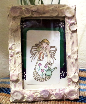 I started by drawing lines with a hot glue gun onto the frame. Then hot gluing different size buttons with some of the buttons with raised lips. The color of buttons doesn't matter as they will be covered with foil. I then wrapped the frame with strips of foil. gluing the edges of the foil down. In this case you don't want to be a perfectionist as the foil crumpled adds to the effect. Paint the foil and let it dry. Then if you wish you can do like I did here and paint another color of top. While the paint is still wet wipe some of the paint off with a damp paper towel. Let dry and you have a one of a kind frame.